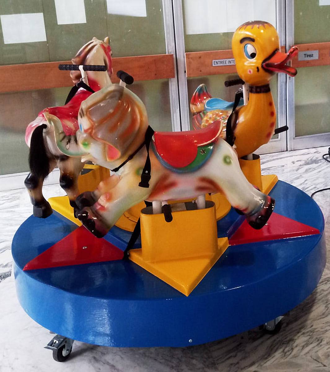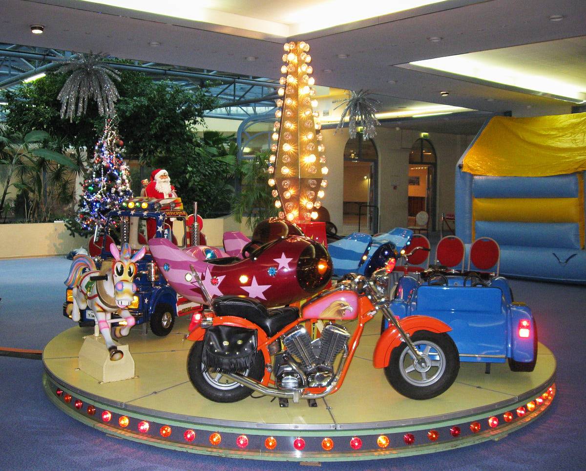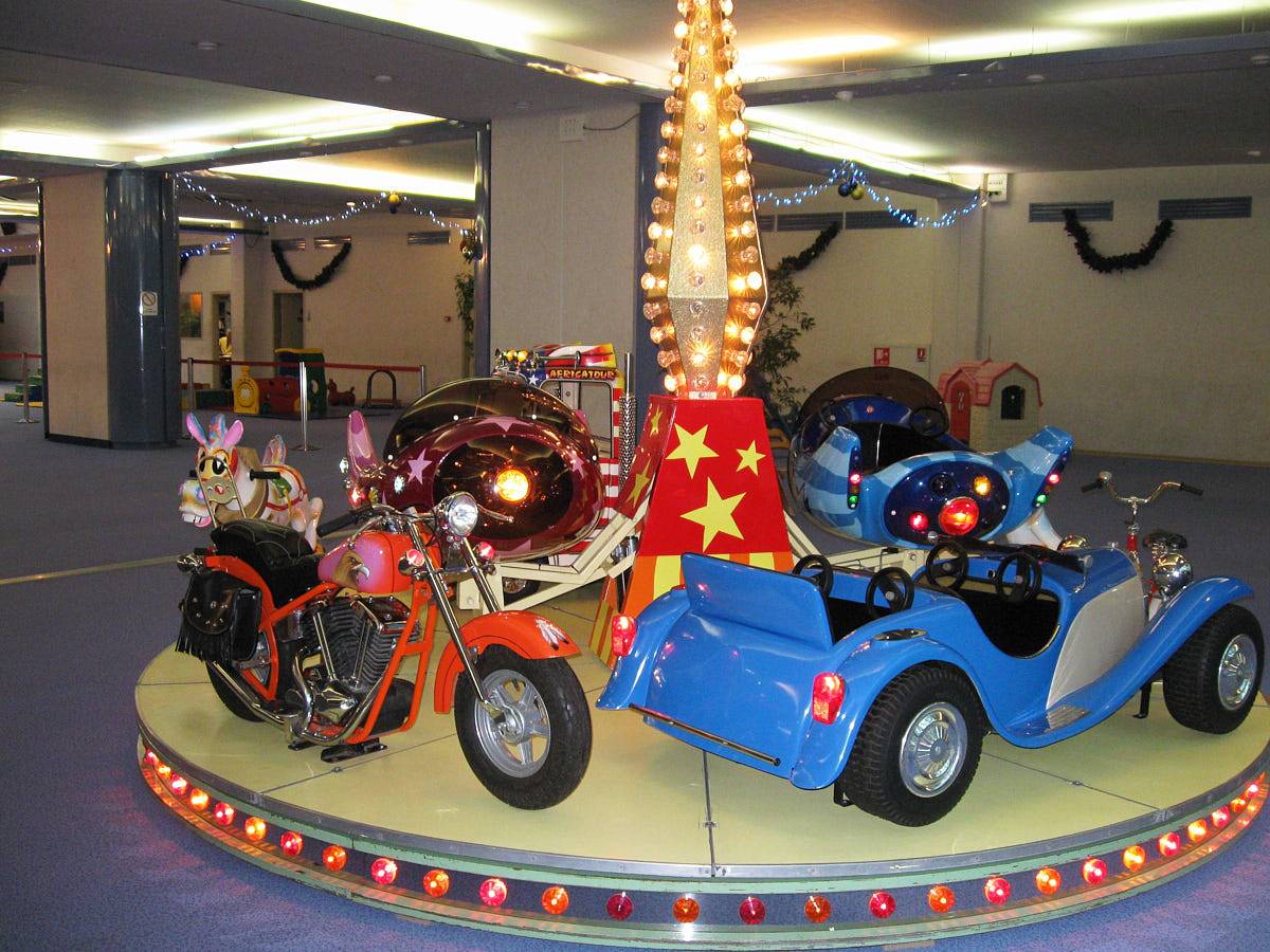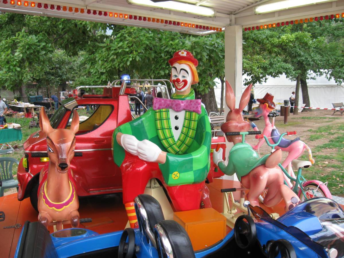 Camion de pompier avec son échelle et le vrai klaxon de pompier, une Bugatti, 1 cheval, 1 lapin, 1 biche, 1 canard, 1 vélo garçon, 1 vélo de filles, un clown (on peut s’assoir dans ses bras), 1 moto de cross, 1 moto pocket