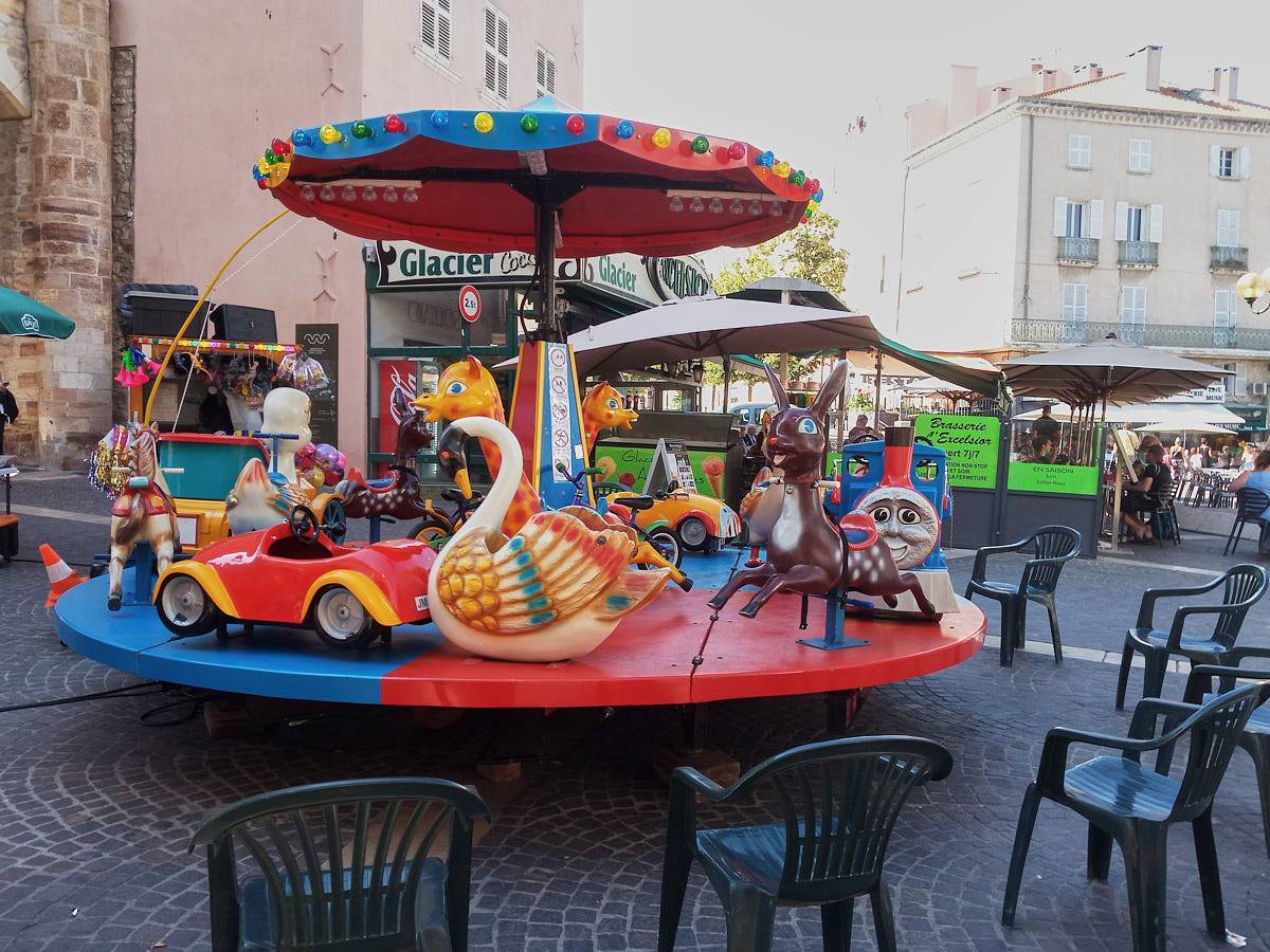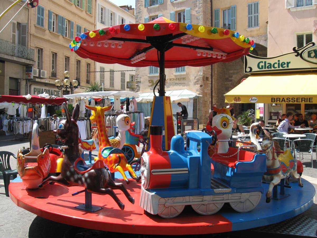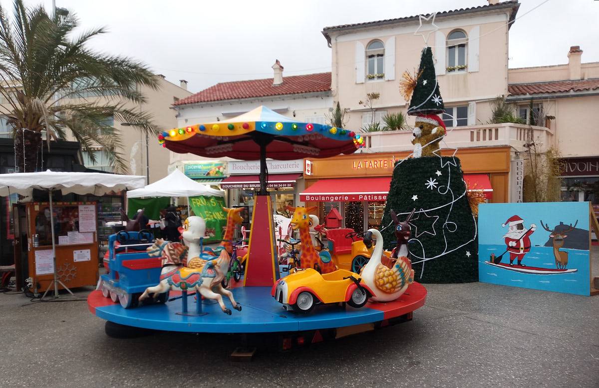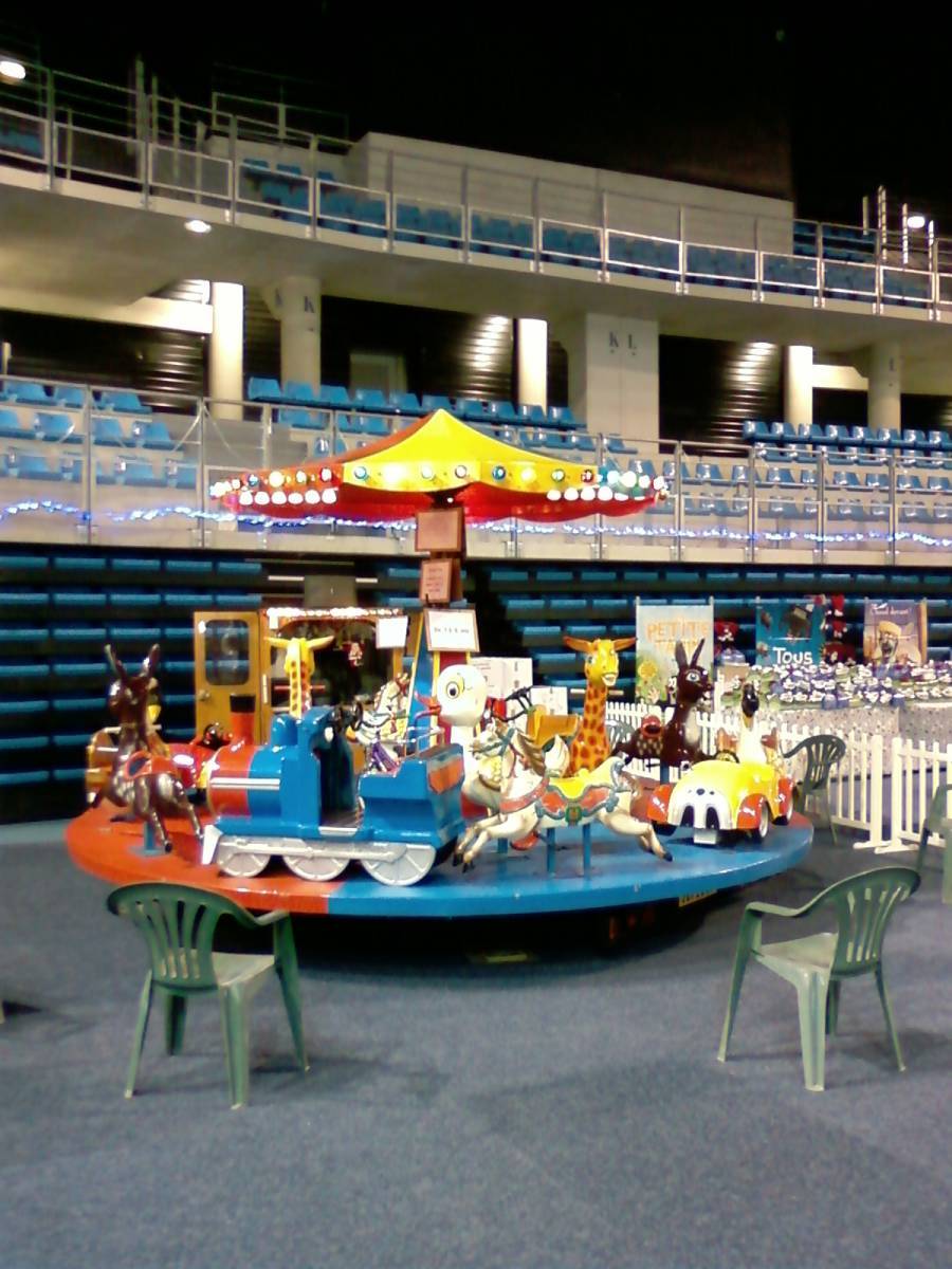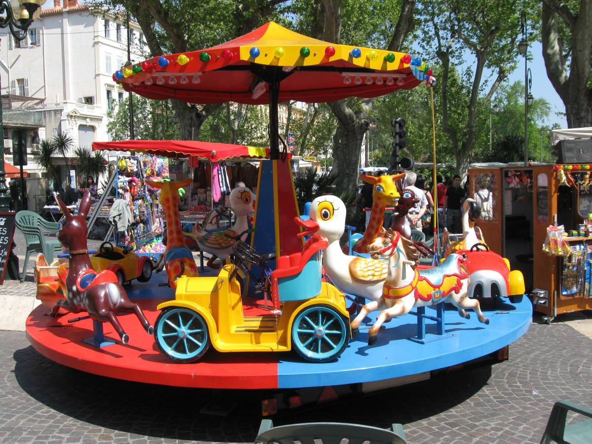 Camion de pompier avec son échelle et le vrai klaxon de pompier, une Bugatti, 1 cheval, 1 lapin, 1 biche, 1 canard, 1 vélo garçon, 1 vélo de filles, un clown (on peut s’assoir dans ses bras), 1 moto de cross, 1 moto pocket